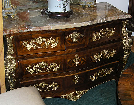 F301. 19th Century French L XV Parquetry, Mahogany and bronze Commode.